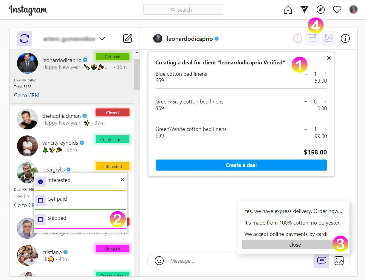 Manage transactions directly from the Instagram messenger in your browser and never lose a single customer.